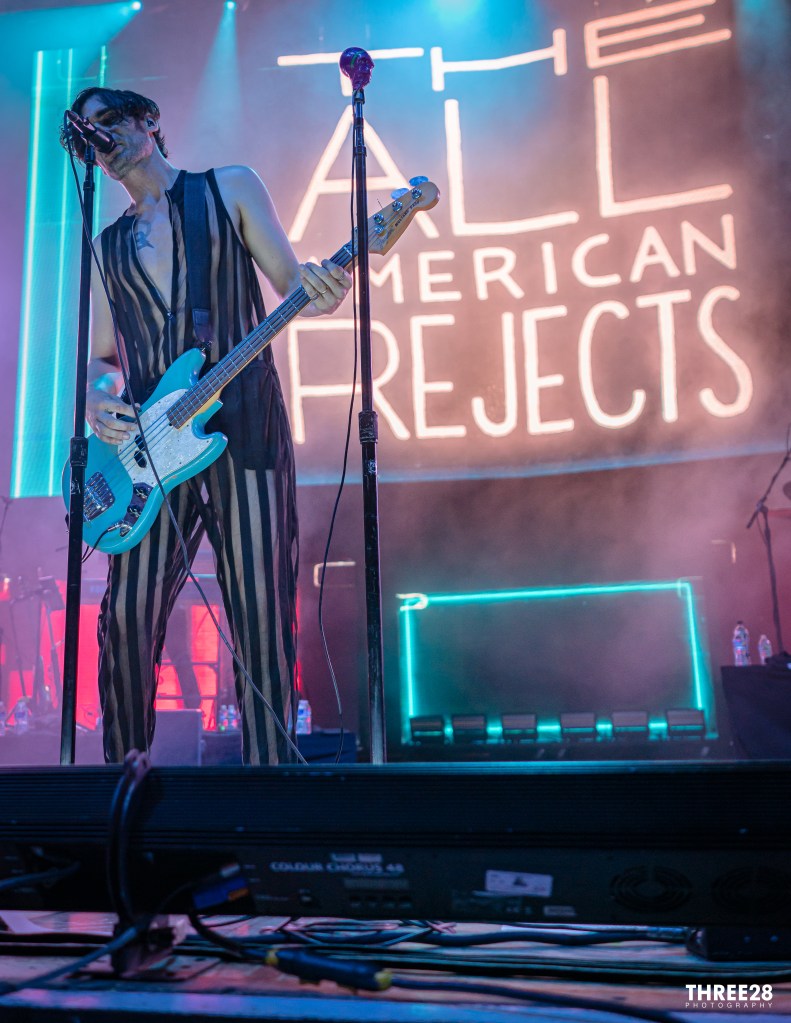 As the lights dimmed even further, the unmistakable sound of cheering fans filled the air. The stage erupted with a burst of lights, smoke and energy as The All-American Rejects took their positions. The collective roar of the crowd was deafening as the band launched into their first song, Swing, Swing, and instantly transporting everyone back to the heyday of emo-pop.