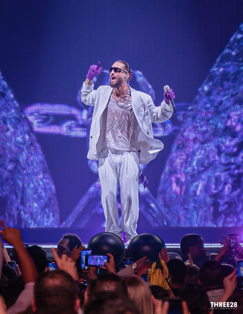 Maluma’s dyanmic performance was one to remember. As he took the stage, the crowd was immediately captivated by his magnetic presence. His dancing was a hypnotic display of rhythm and charisma, moving effortlessly to the beat. His hyped demeanor ignited the atmosphere with infectious energy, his vocal work was equally impressive, effortlessly hitting high notes and delivering every lyric with the passion and precision that made this man a megastar. The Medellín native truly embodied the essence of an all-world entertainer, seamlessly transitioning between songs and engaging the audience in a way that left no doubt as to why he’s a global sensation. The stage itself, shaped like a gigantic “M,” was a fitting tribute to his moniker, and it added an extra layer of grandeur to an already grand performance.