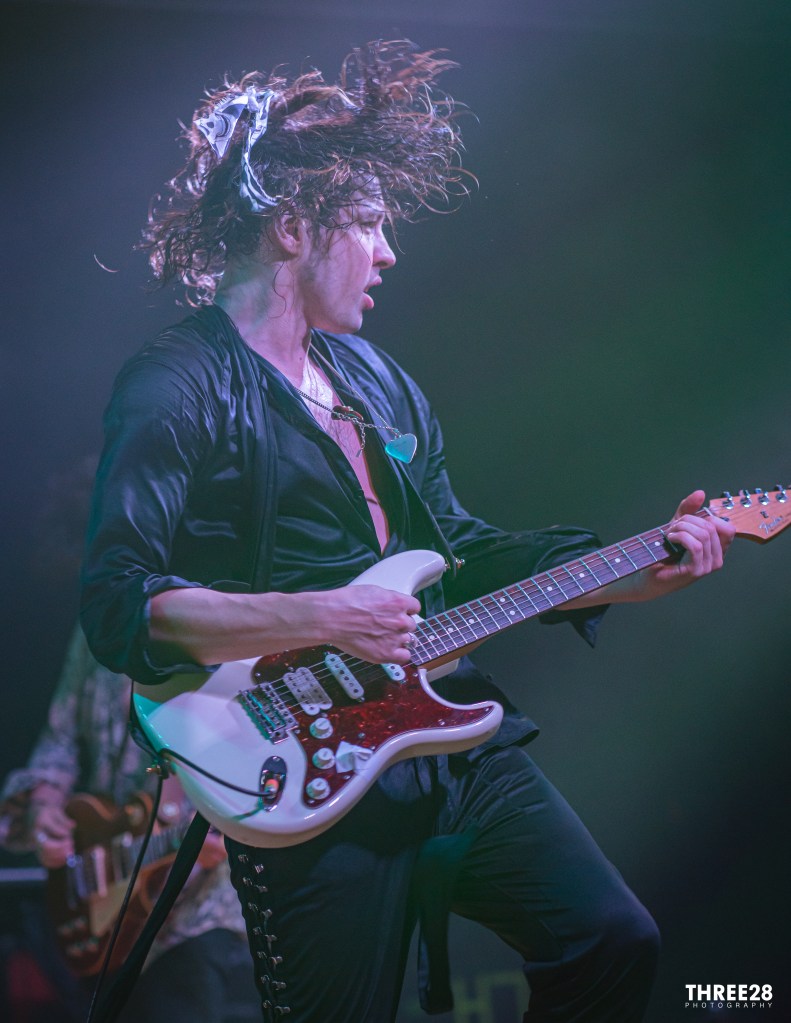 From the very moment Barns Courtney graced the stage, it was evident that the night would be momentous. His rock-til-you-drop attitude to showmanship was palpable, and he wasted no time in launching into his first song with a vigor that had the crowd on their feet, ready to follow him anywhere. Barns Courtney’s attire added to the spectacle. He sported a white jacket with a cheerful, oversized happy face on the back, red high-top leather shoes, and all-black leather pants and shirt. His outfit, like his music, was a combination of playful exuberance and the raw, rebellious spirit of the rock music circuit.