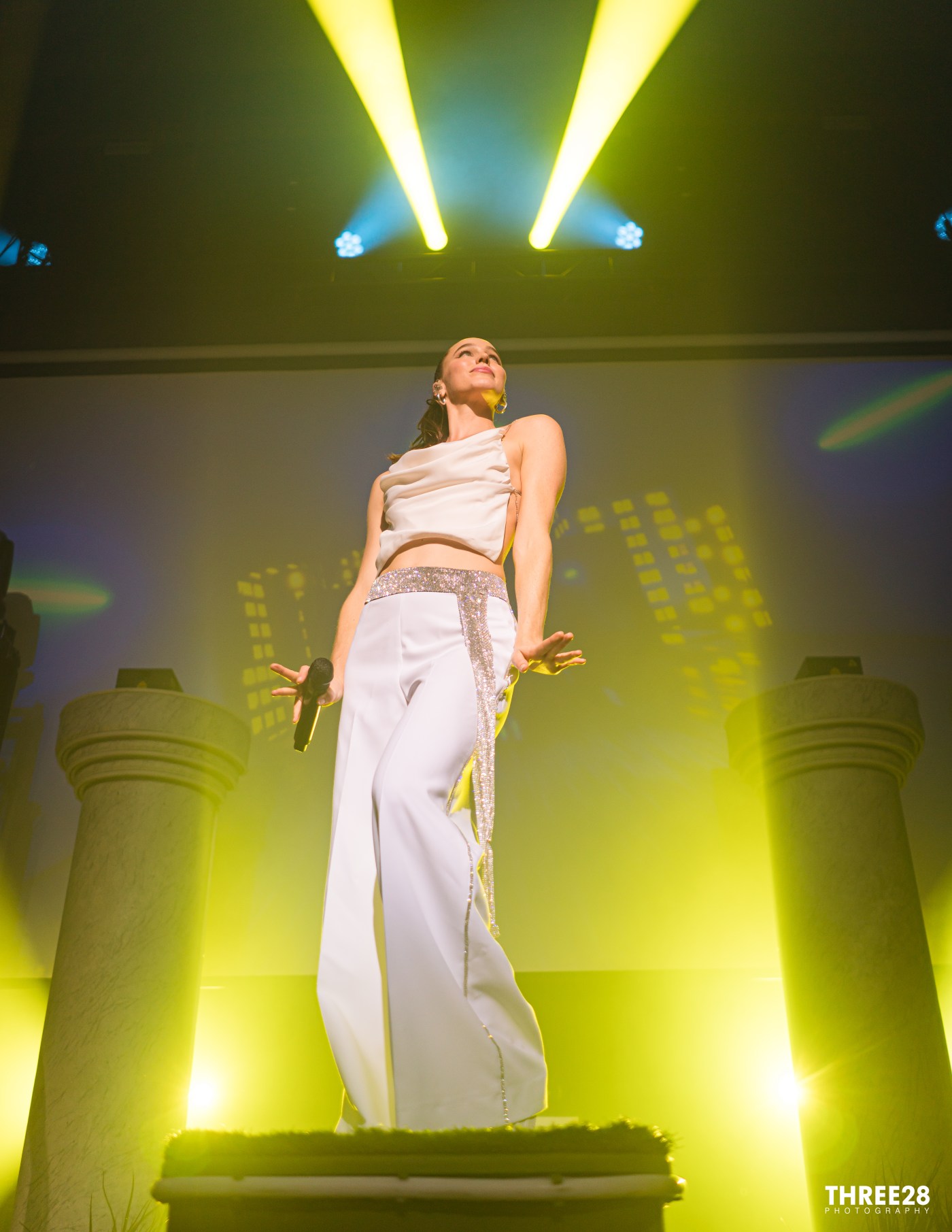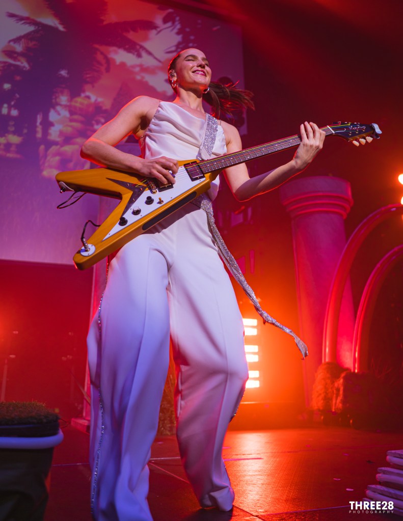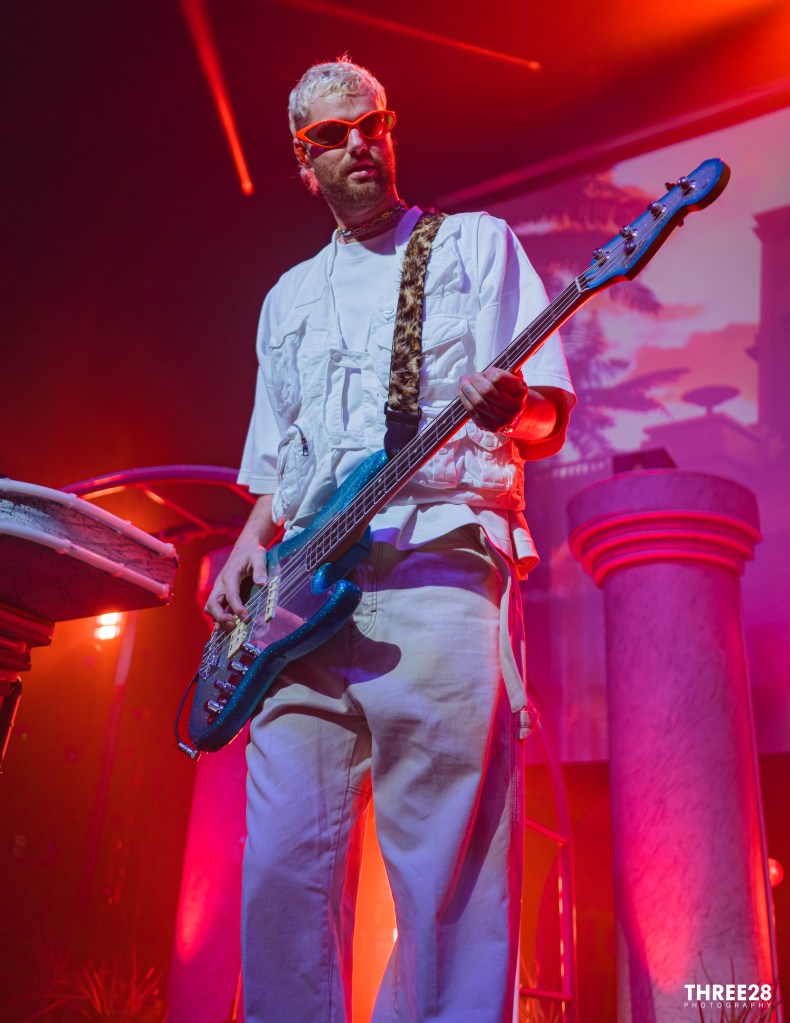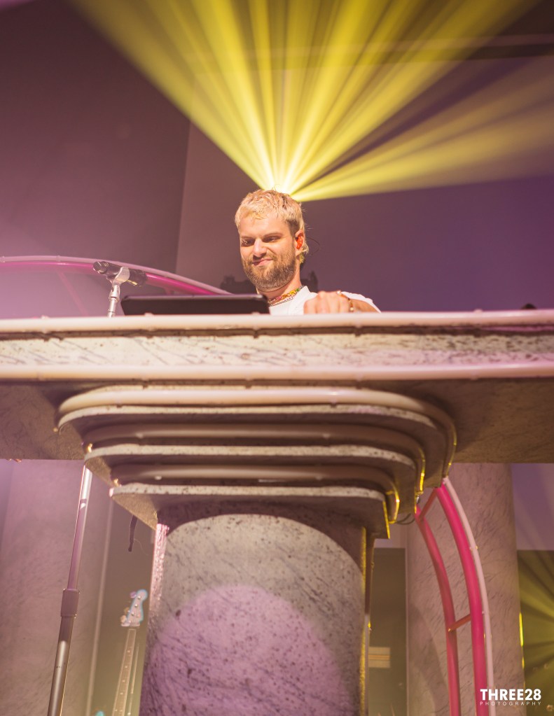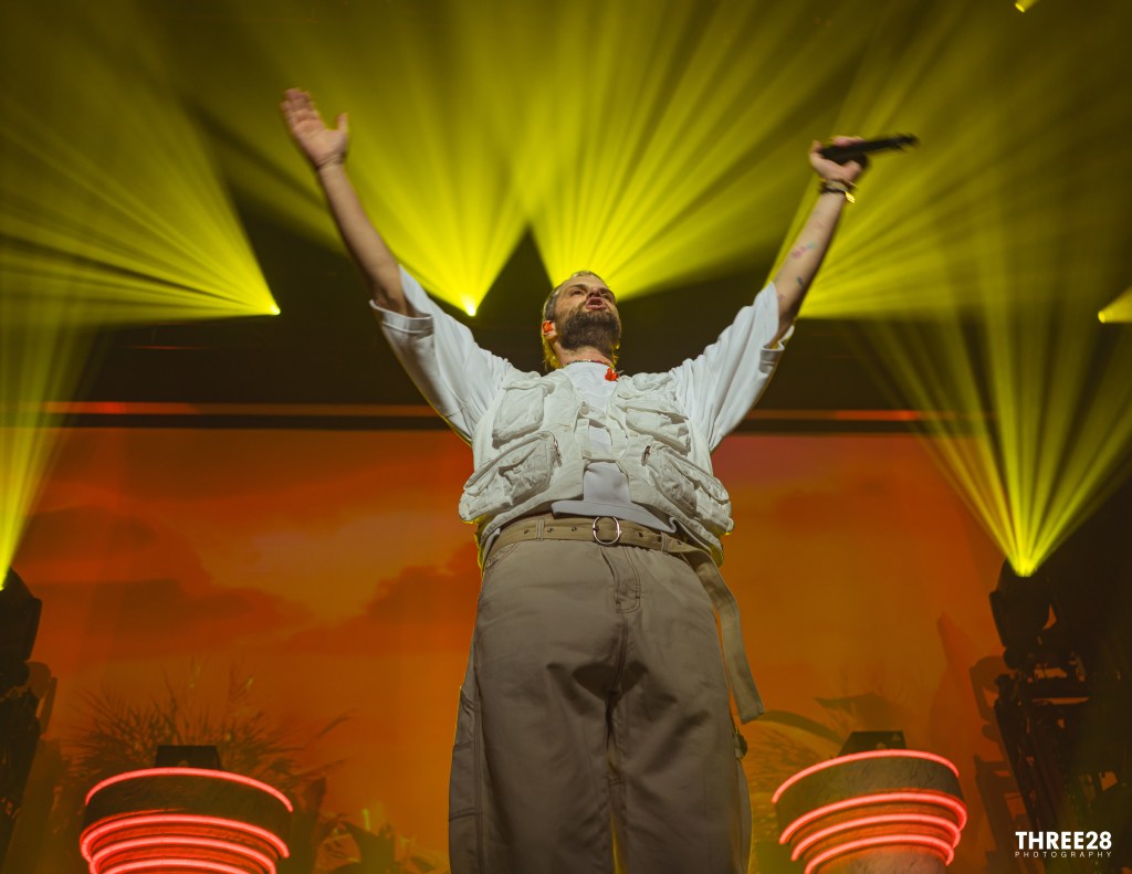 Visually, the stage setup was a nostalgic nod to the ‘80s party scene, with vibrant neon lights and playful designs that evoked a sense of whimsy and celebration. Pillars and arches adorned with bright colors, a graphic screen and risers filled the space, creating an atmosphere that felt both retro and refreshing. Dynamic lighting complemented the lively performance, shifting in rhythm with the music to heighten the emotional impact of each track. The interplay of light and sound forged an intoxicating ambiance that kept the audience engaged and energized throughout the evening.