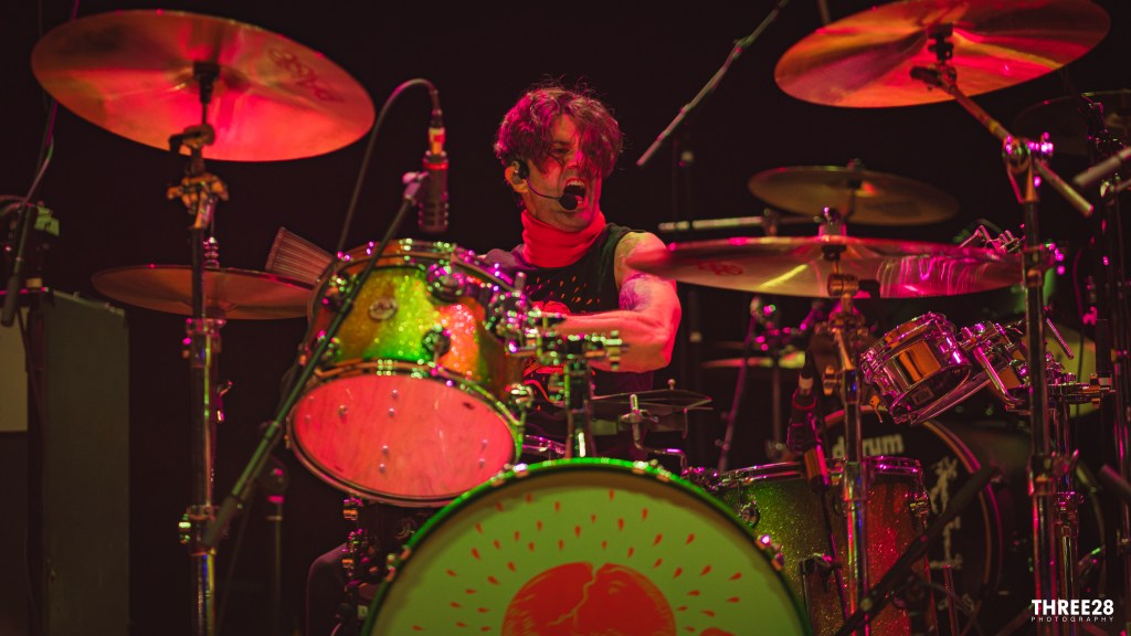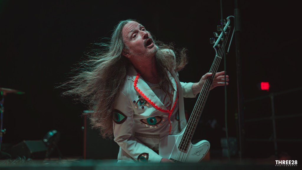 Emerging under minimal lighting and devoid of any stage decoration — no banners, projections, or even band logos — the trio-turned-quartet relied entirely on their chemistry and raw musicianship. The current tour bears a surprise that long-time fans are relishing: the unexpected but glorious return of drummer Coady Willis, transforming the rhythm section into a thunderous dual-drummer configuration alongside the ever-dependable Dale Crover. This twin-percussion attack brought a muscular complexity to the performance, particularly during songs like “Honey Bucket” and “The Bloated Pope,” where interlocked polyrhythms and tribal pulses elevated the material to towering intensity. Willis’ comeback was greeted with roaring approval and, from a technical perspective, the added layers of rhythm gave the performance a broader sonic palette.