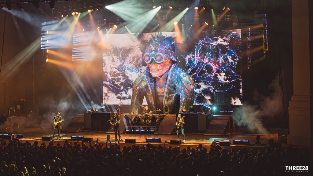 Midway through the set, the band launched into “Blind Side Sonny,” one of the more theatrical pieces from The Father of Make Believe. As the opening chords built into frenetic riffs, a towering inflatable figure emerged at the back of the stage — easily twenty+ feet tall. It was the character Sonny from the novel, armored in a spiked helmet and jagged leather jacket, his grotesque silhouette backlit to maximal effect. This moment served as a tangible bridge between the literary and musical worlds Coheed straddles, reminding the audience that this band’s universe is not merely conceptual, but manifest.