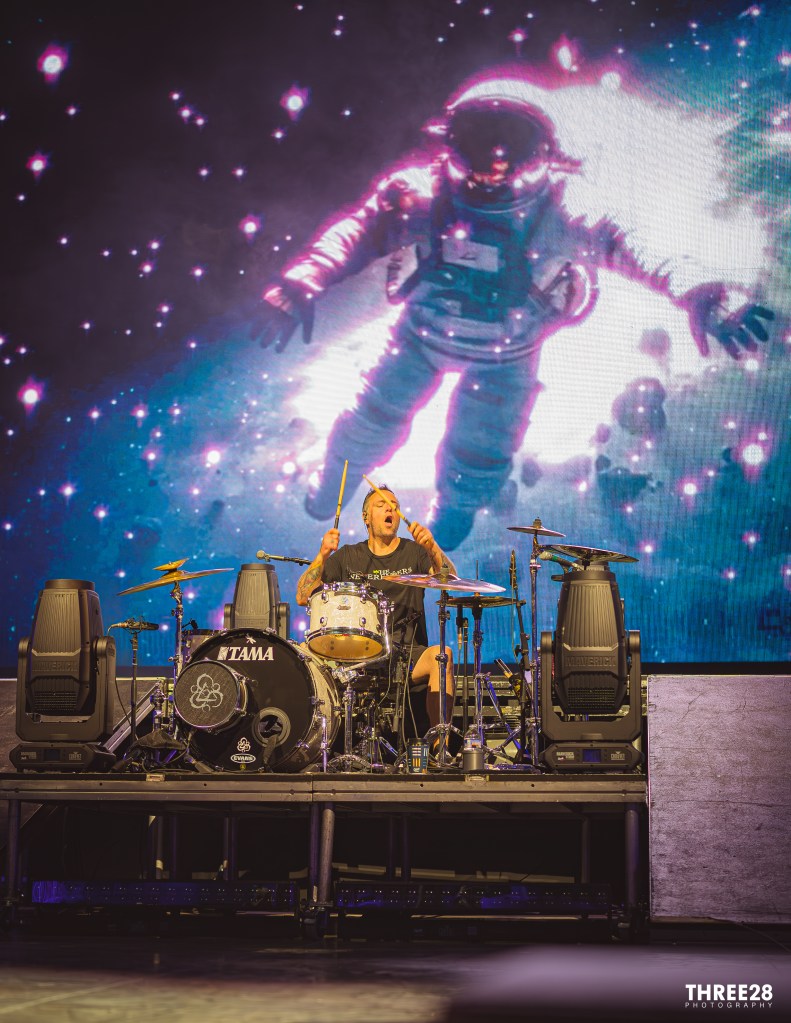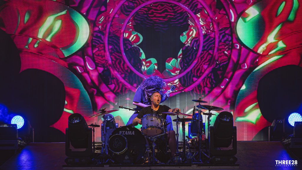 A key visual element of the performance was the intricately designed stage setup. Eppard and his drum kit sat elevated on a raised mini-stage, granting him both visibility and symbolic prominence as the heartbeat of the band. To either side were mini-risers from which Sanchez would leap or perch, like a cosmic bard surveying his mythic domain. Behind them, a massive digital screen ebbed and flowed with space-like visuals — nebulae, comets, and arcane glyphs — synced seamlessly with the themes of each track. It was not mere backdrop, but narrative reinforcement, binding the live music to The Amory Wars, the sprawling science-fiction saga that informs Coheed and their unique discography.