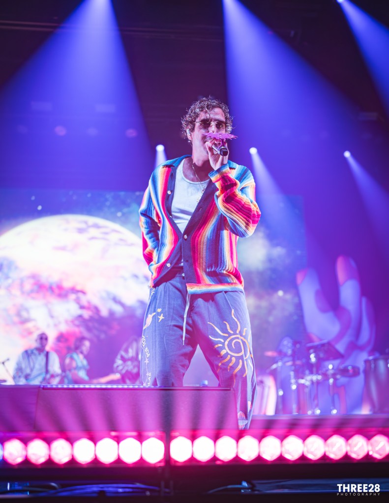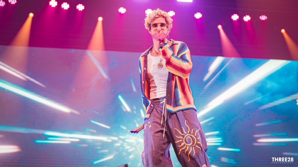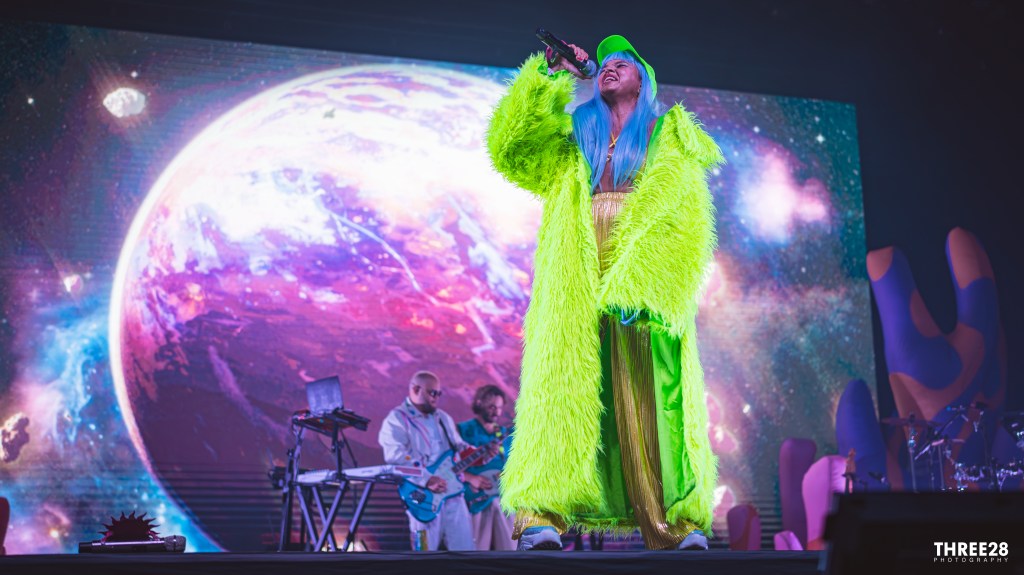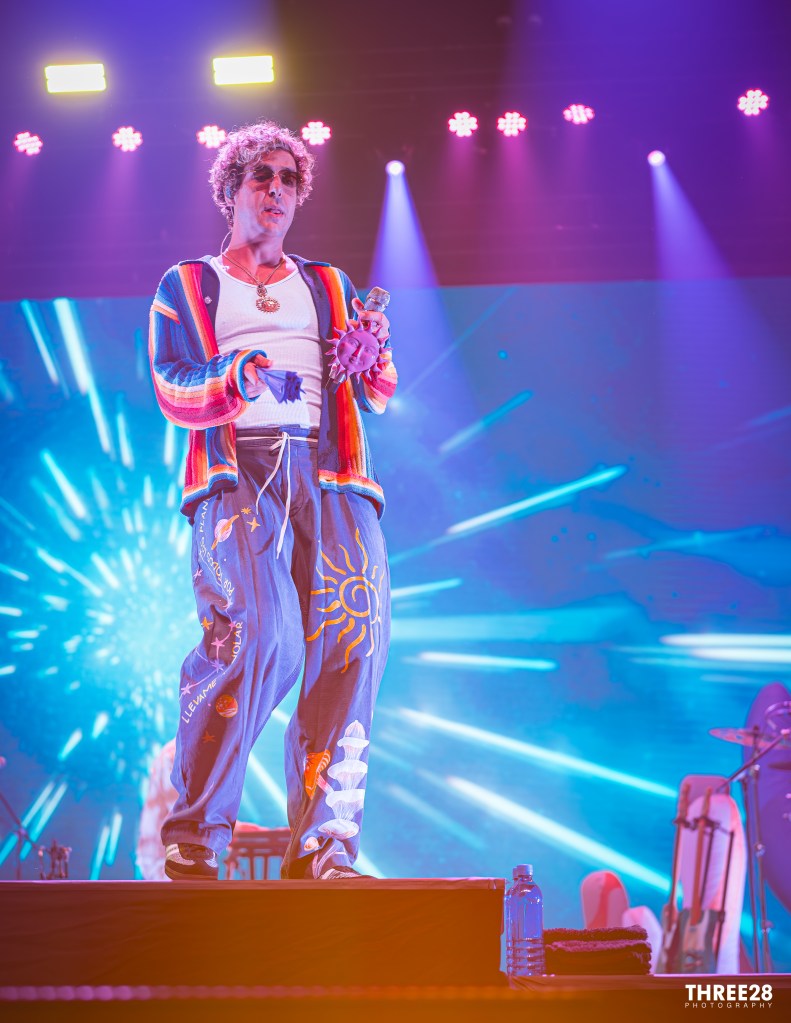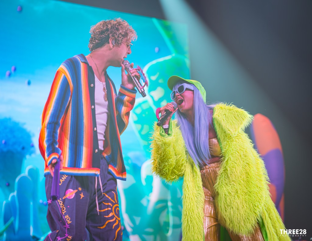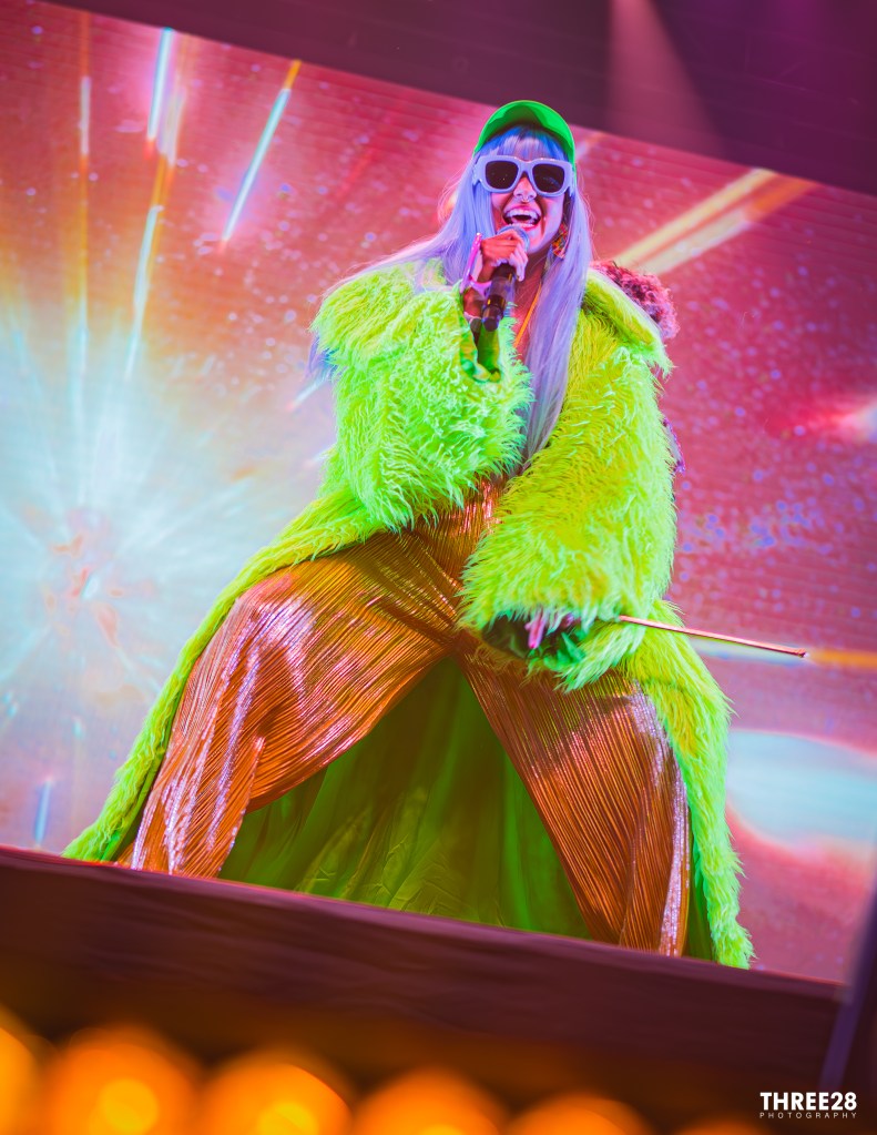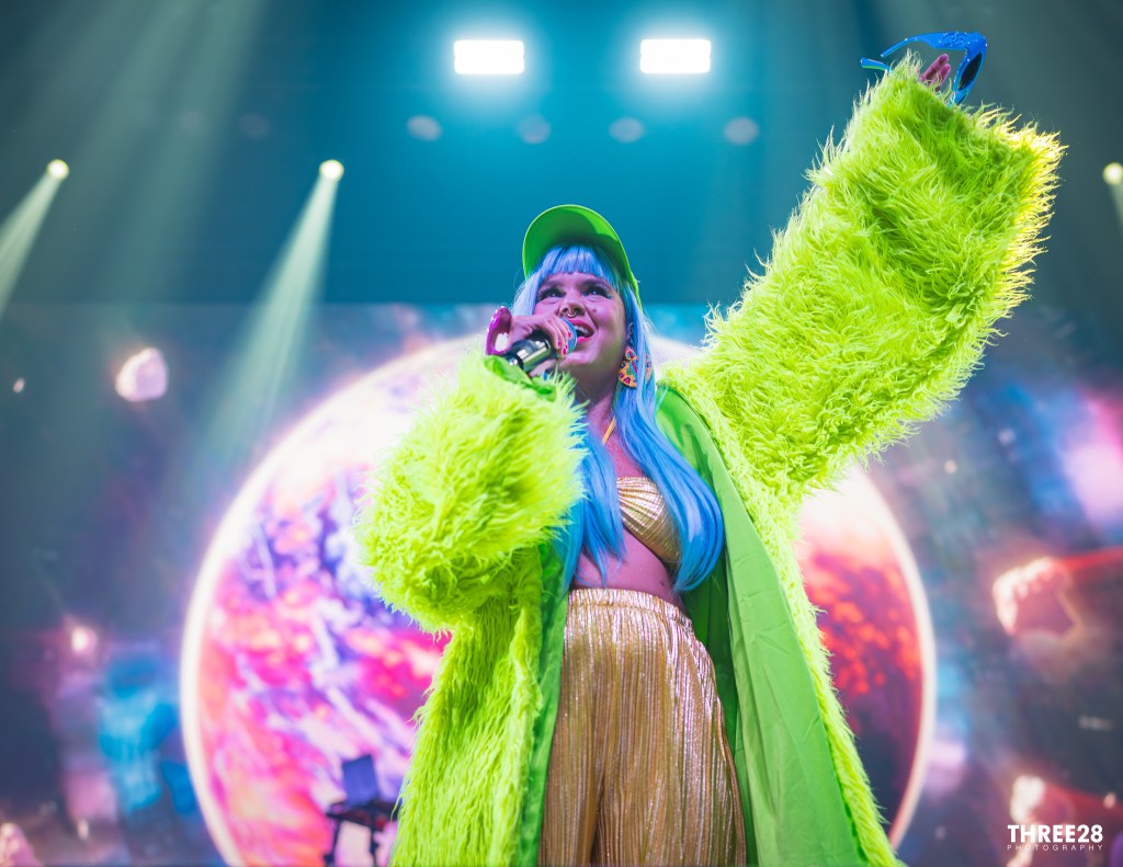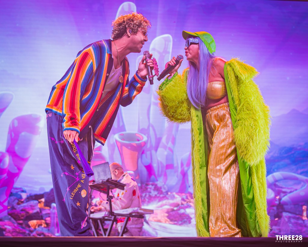 From the moment Saumet and Montenegro stepped onto the vividly lit stage, it was clear this was more than a concert — it was a ritual of joy. Saumet, never one to shy away from statement fashion, stunned in a grinch-green furry coat, a matching cap that shimmered under the LED strobes, and metallic gold pants that reflected the pulsing light like a disco ball. Montenegro, equally vibrant, wore a neon red and orange themed sweater top and carried around a purple hand fan, exuding a warm charisma that counterbalanced Saumet’s electric presence. Their microphones were adorned with red plastic sun and moon attachments — a visual representation of balance and celestial harmony. As they danced across the stage, the duo even unfurled Colombian and Venezuelan flags as capes, reminding the audience that Astropical is also a celebration of cross-cultural solidarity.