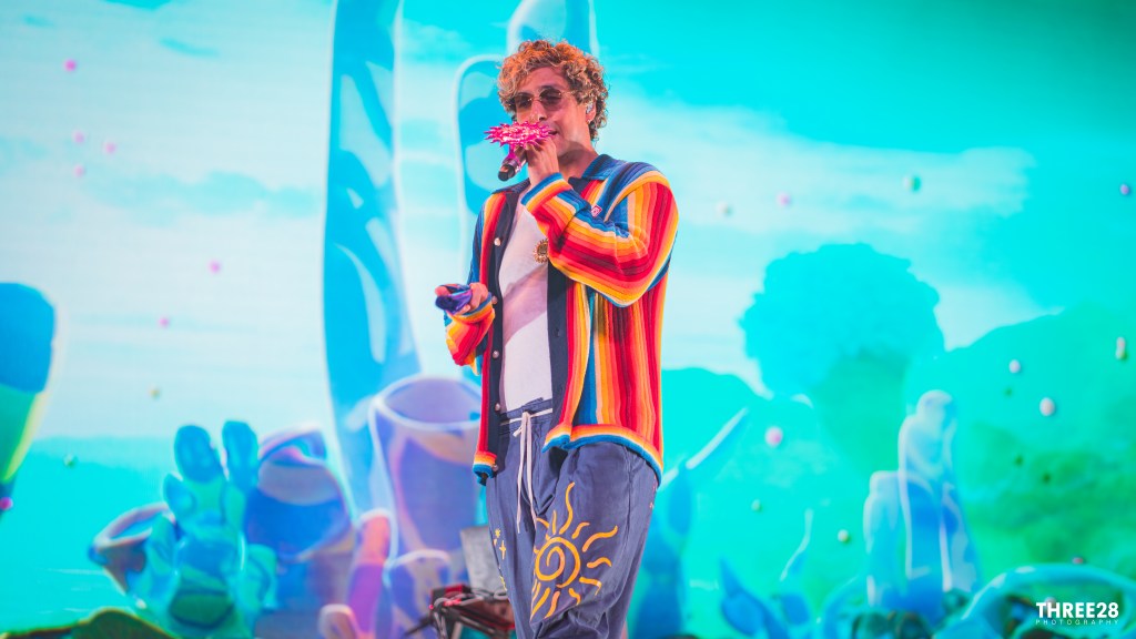 The energy flipped from introspective to playful just minutes later when the band launched into a slyly exuberant cover of Proyecto Uno’s ‘El Tiburón’. The crowd, already on their feet, erupted into synchronized bouncing as the group gave the merengue-house classic a psychedelic twist. With rubbery basslines, percussive breakdowns, and neon animations of cartoon sharks swimming across the screen, the number was both homage and reinvention — a cheeky nod to the ’90s that fit surprisingly well within Astropical’s universe.