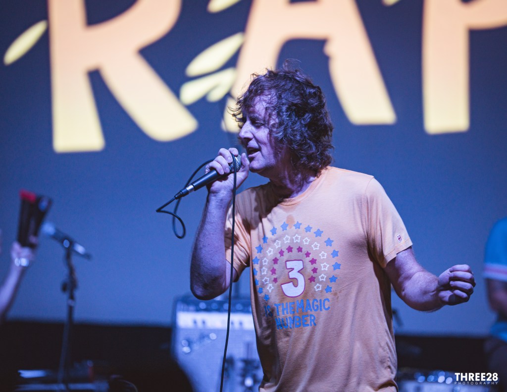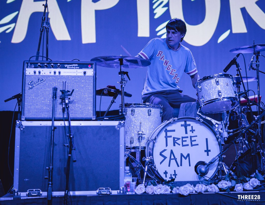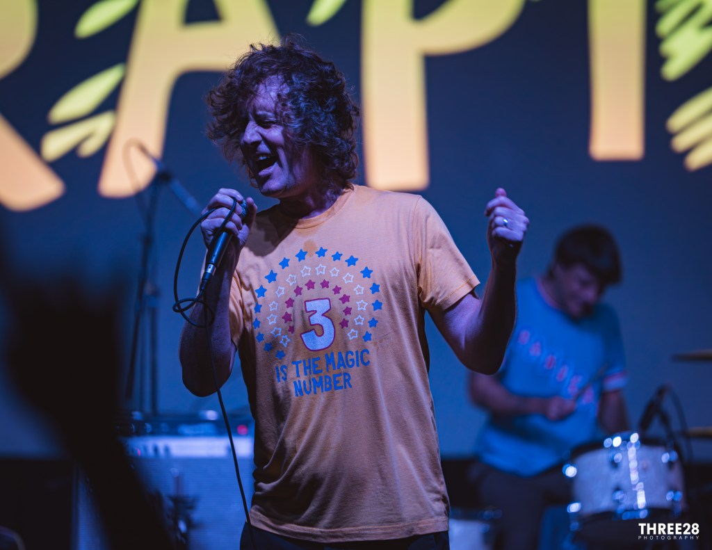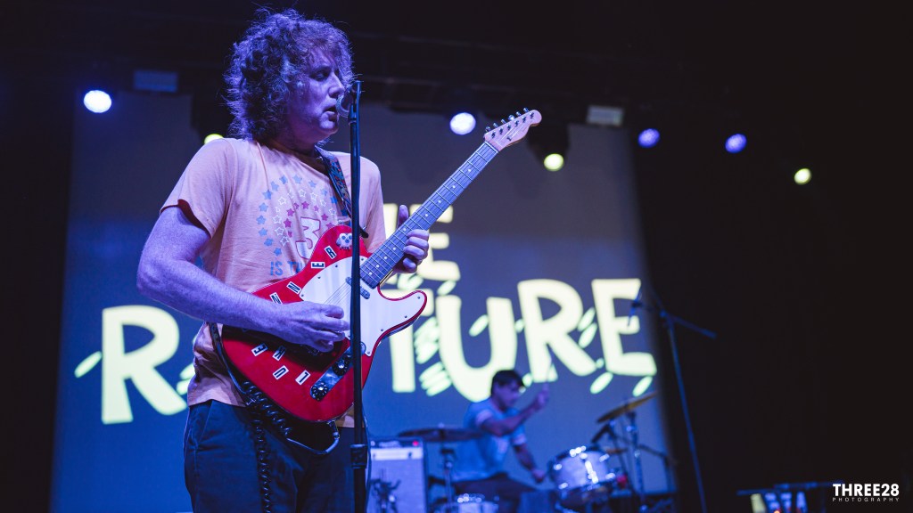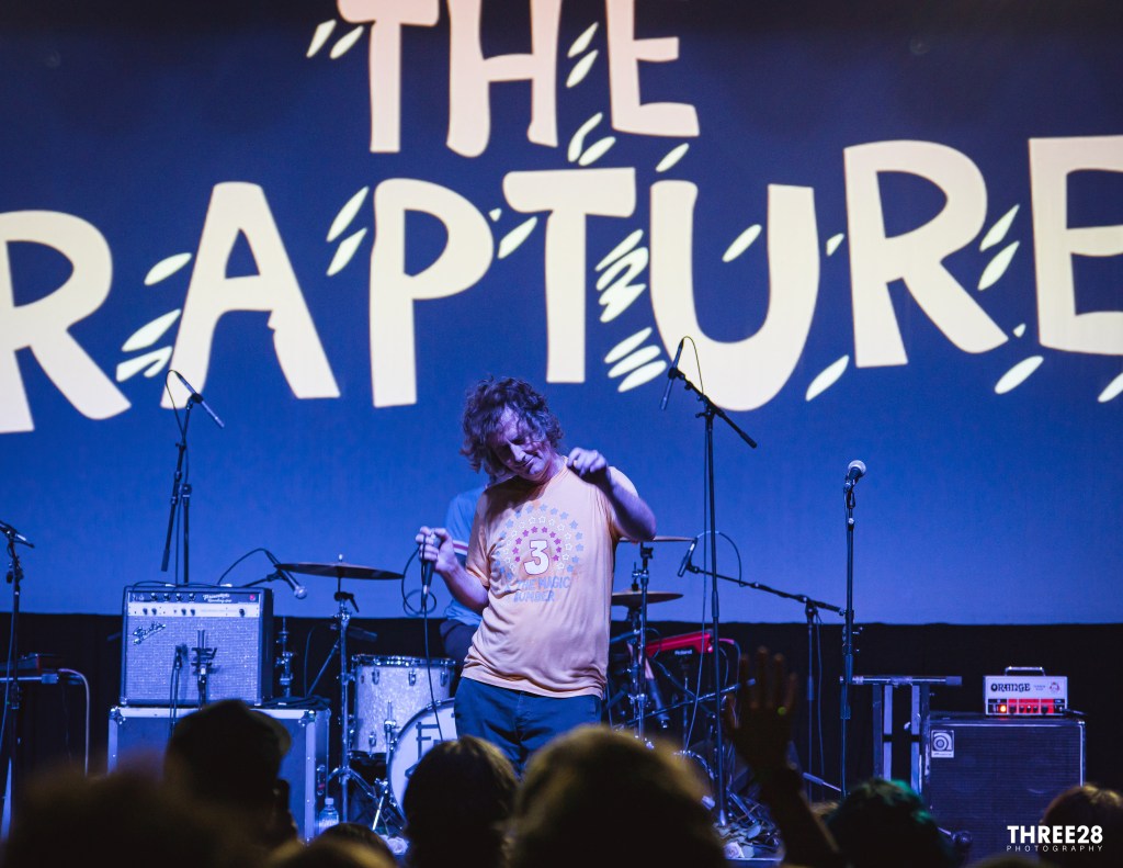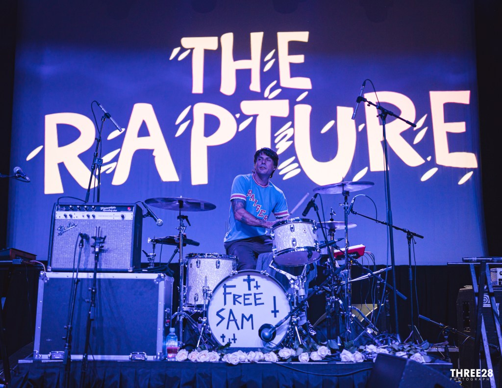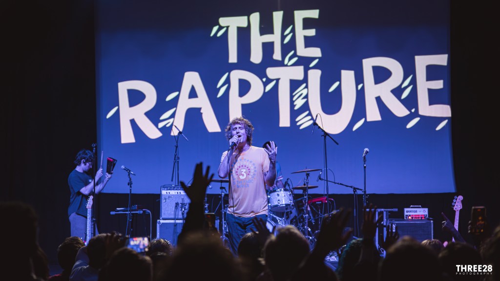 The room is intimate: a modest stage, a single cloth banner behind the band bearing “The Rapture,” and just enough rigging for minimal lighting rigs. No huge video screens, no pyrotechnics, no overwhelming stagecraft — the austerity felt purposeful. In that setting, every nuance of sound, every flicker of expression, becomes magnified. Luke Jenner and company are about to provide those on hand with quite a party.